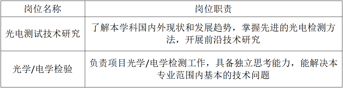 5.所有岗位要求本科及以上学历;光学、光学工程、测试计量技术及仪器、物理学、电子信息、仪器仪表、通信与信息系统、信号与信息处理、力学等相关专业。