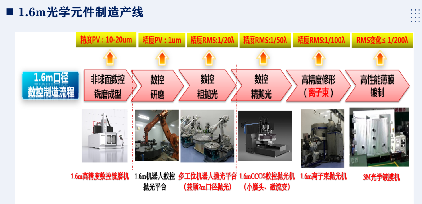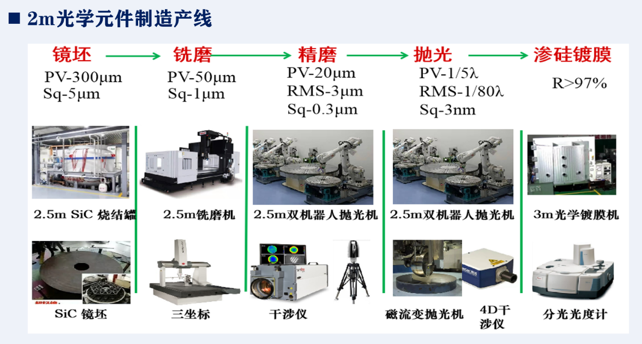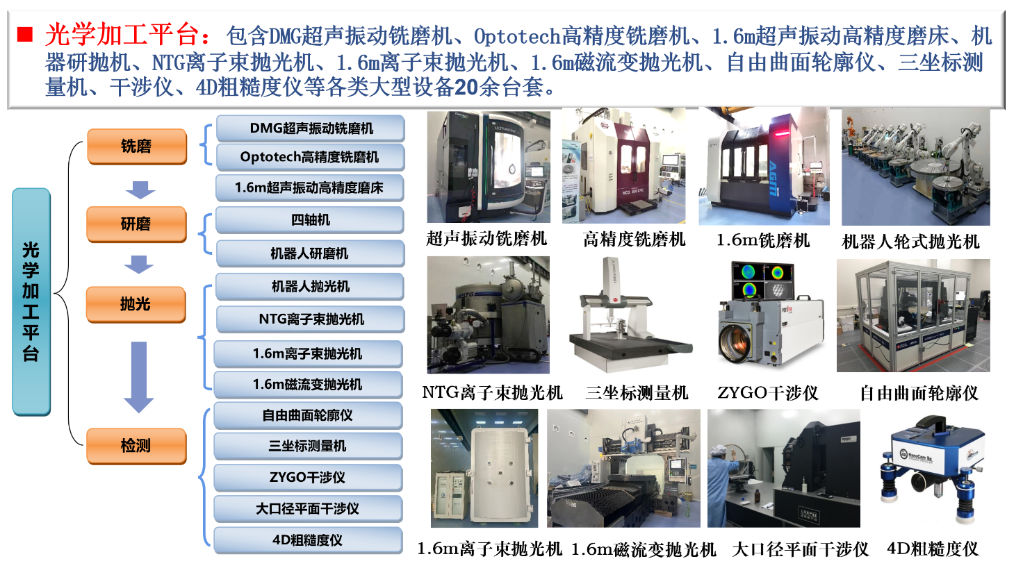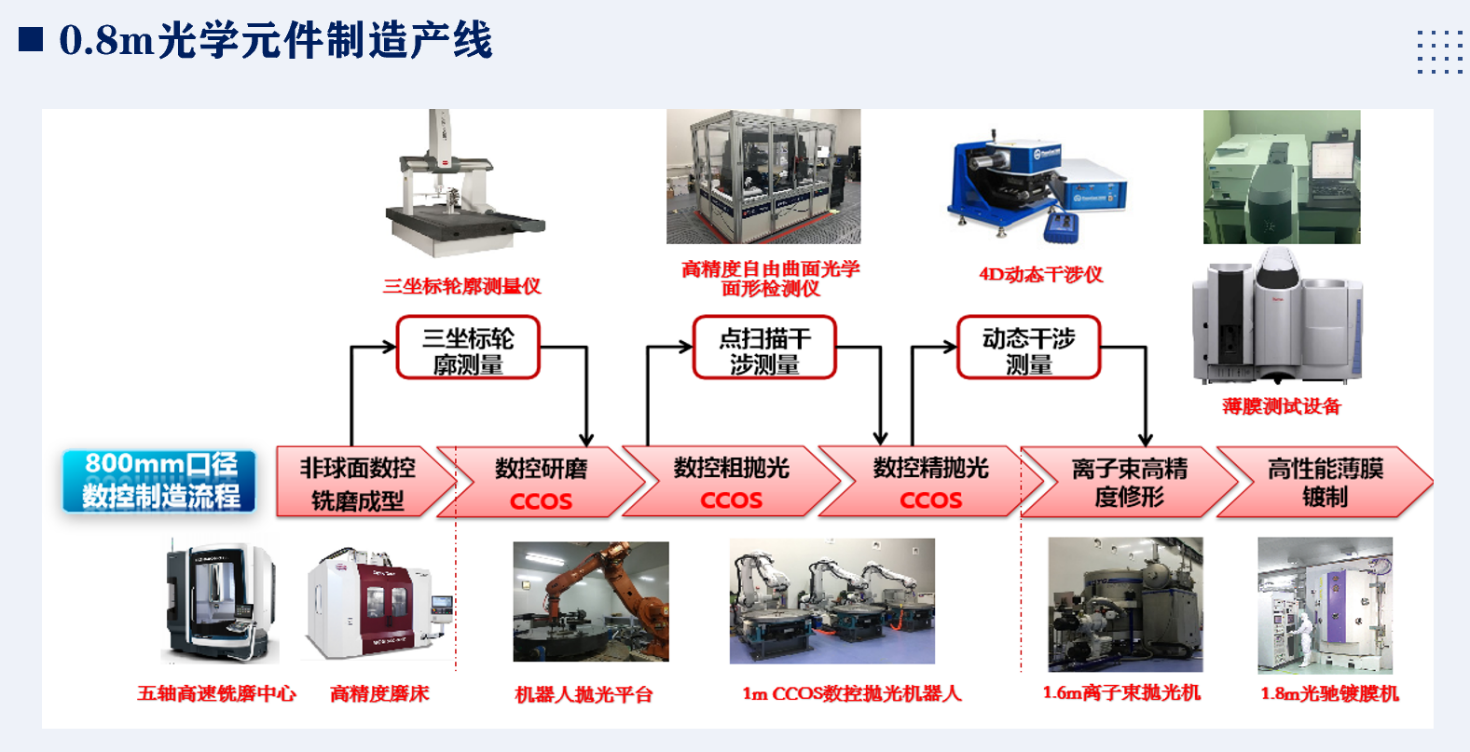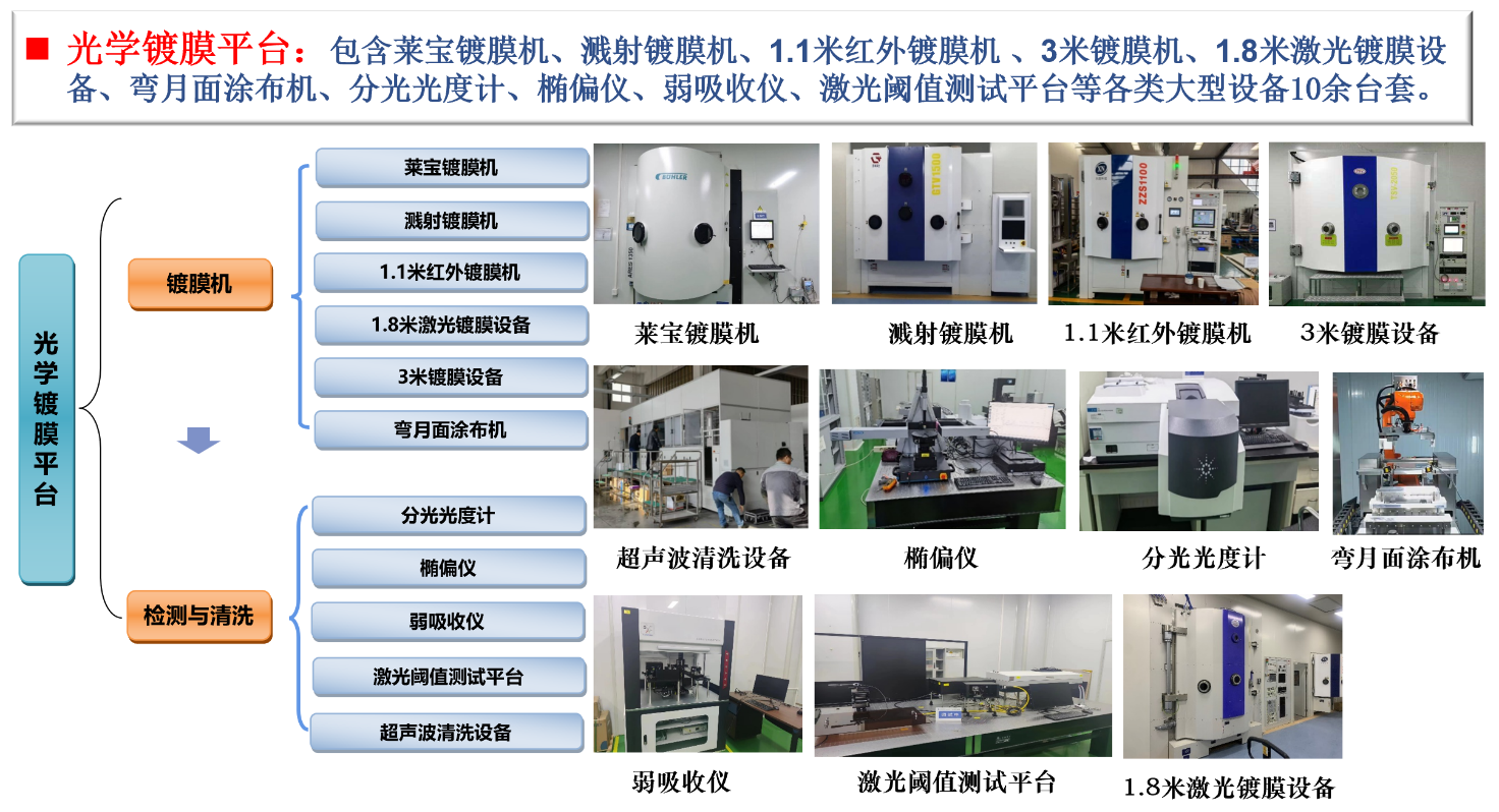 先进光学元件试制中心拥有60余台套光学加工与镀膜设备,资产总值约1.4亿元。具备“磨削-抛光-镀膜-检测”全工艺流程能力及0.8m、1.6m与2.5m三条光学元件研制生产线。可以实现年产5块米级以上大口径光学元件和年产20块米级以下中等口径光学元件制造能力。