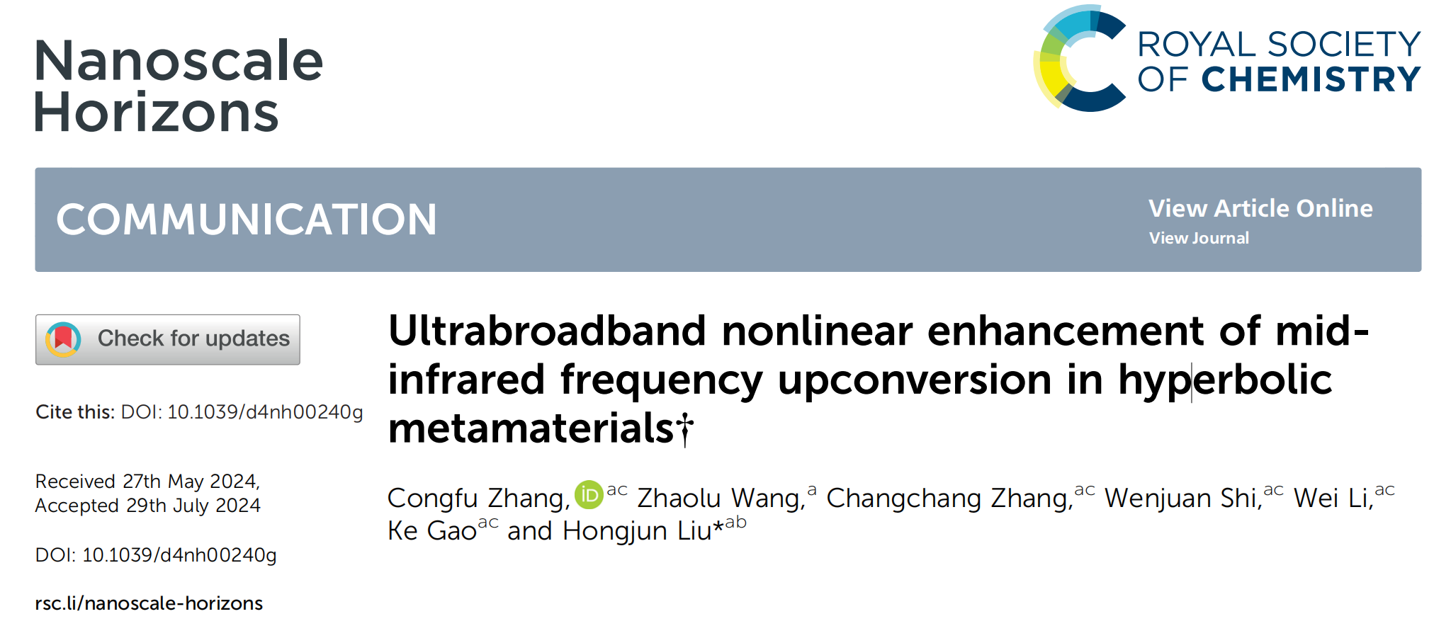 近日,瞬态光学与光子技术国家重点实验室非线性光子技术及应用课题组在超表面非线性光子学领域取得重要进展,相关研究成果发表于国际著名期刊 Nanoscale Horizons,论文第一作者为 2021 级博士生张淙阜。