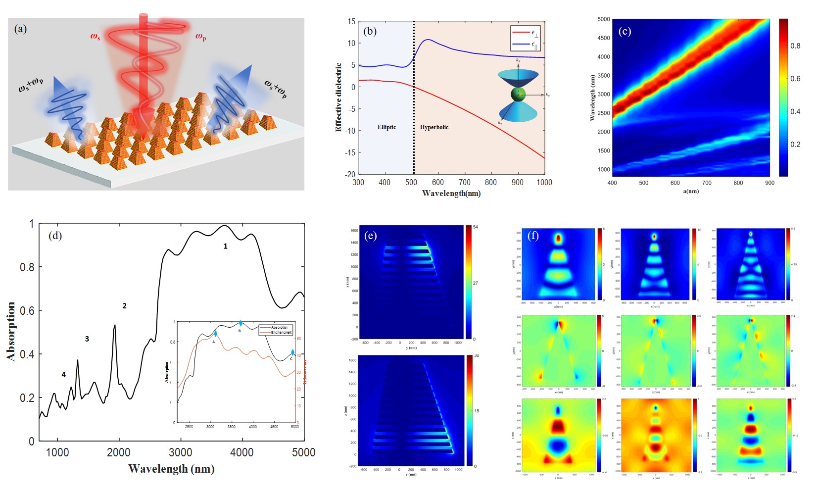 图(a) 超表面结构单元;(b) 介电常数曲线;(c, d) 吸收光谱;(e, f) 不同波长下的局域场