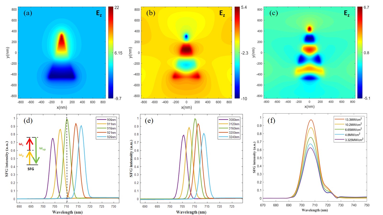 图(a) 3160 nm; (b) 916 nm; (c)710 nm.电场Ez分量的分布;(d, e) 不同信号光与泵浦光产生的上转换光强度;(f) 不同信号光强度下产生的上转换光强度