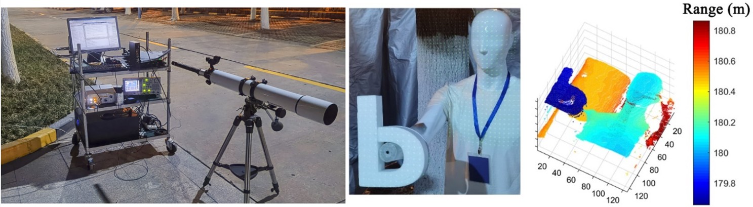 图1 望远镜可重配置共轴SPAD阵列激光雷达系统及三维成像实验结果