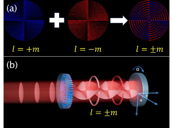 在目标的识别上,除目标距离和反射率等重要参数外,探测目标的速度和转动速度更有助于提升目标识别率。张同意研究员团队与王国玺研究员带领的超表面研究小组合作提出一种通过单层超表面生成共轭拓扑涡旋光束的紧凑型转速测量方法。