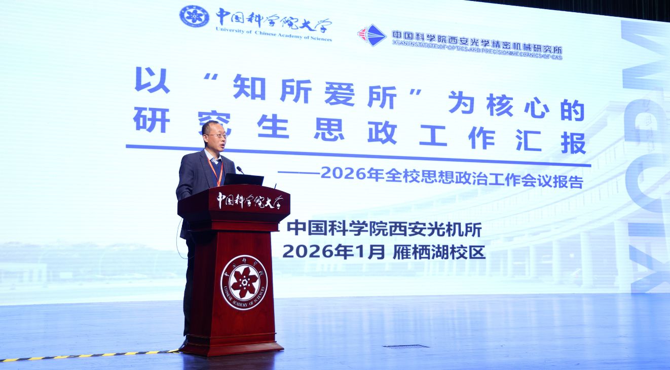1月27日,中国科学院大学2026年思想政治工作会议在北京雁栖湖校区礼堂召开,中国科学院西安光机所副所长(法定代表人)邵晓鹏受邀参加并作《以“知所爱所”为核心的研究生思政工作》的专题报告。图 邵晓鹏作报告...2026-01-30