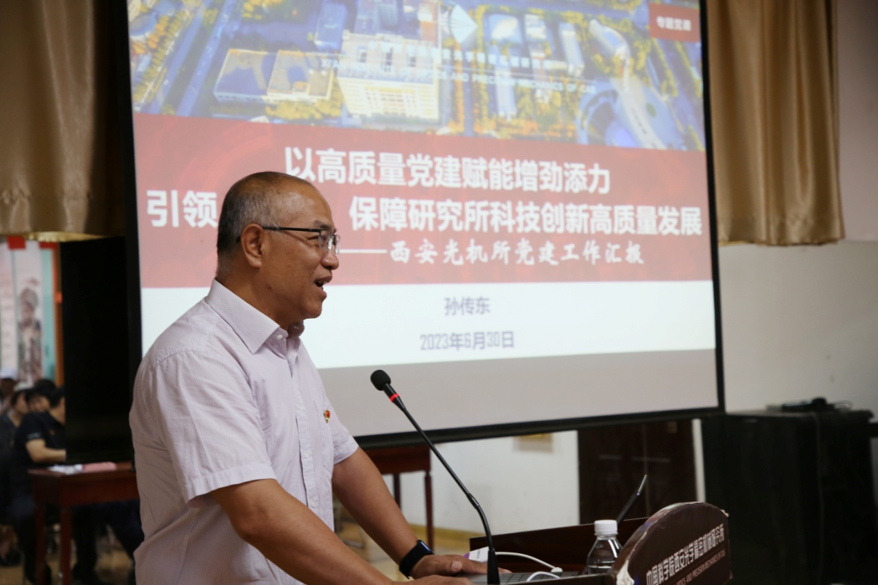 孙传东以《以高质量党建赋能增劲添力、引领、支撑、保障研究所科技创新高质量发展》为题讲专题党课。他首先简要介绍了研究所党建工作及推进学习贯彻习近平新时代中国特色社会主义思想主题教育的情况,随后详细讲解了以“五个注重”抓实 “六个建设”、强“三个突出”促党建科研融合以及牢记习近平总书记殷殷嘱托扎实开展主题教育两方面内容,重点阐述了以政治引领加强离退休干部党建的新部署、新要求。并强调研究所在离退休干部党组织建设中要充分发挥离退休党组织和离退休管理部门的作用,将各项工作活动有效联动融合,对离退休党员、同志做到政治上尊重、思想上关心、生活上照顾、精神上关怀,同时注重发挥离退休同志政治、威望、经验优势,共同发力做好新时代研究所离退休党建工作。他强调,西安光机所老一辈科研工作者为“两弹一星”等重大国家任务做出了重要贡献,经历的光辉历程,取得的光辉成就对于年轻人传承与发扬“西光精神”具有重要意义与作用。 西安光机所年轻一代科研工作者要继续弘扬科学家精神,继续发扬老一辈西光人精神,要心系国家事,肩扛国家责,面对新形势、新要求,聚焦主责主业,打造专业领域的“国家队”。