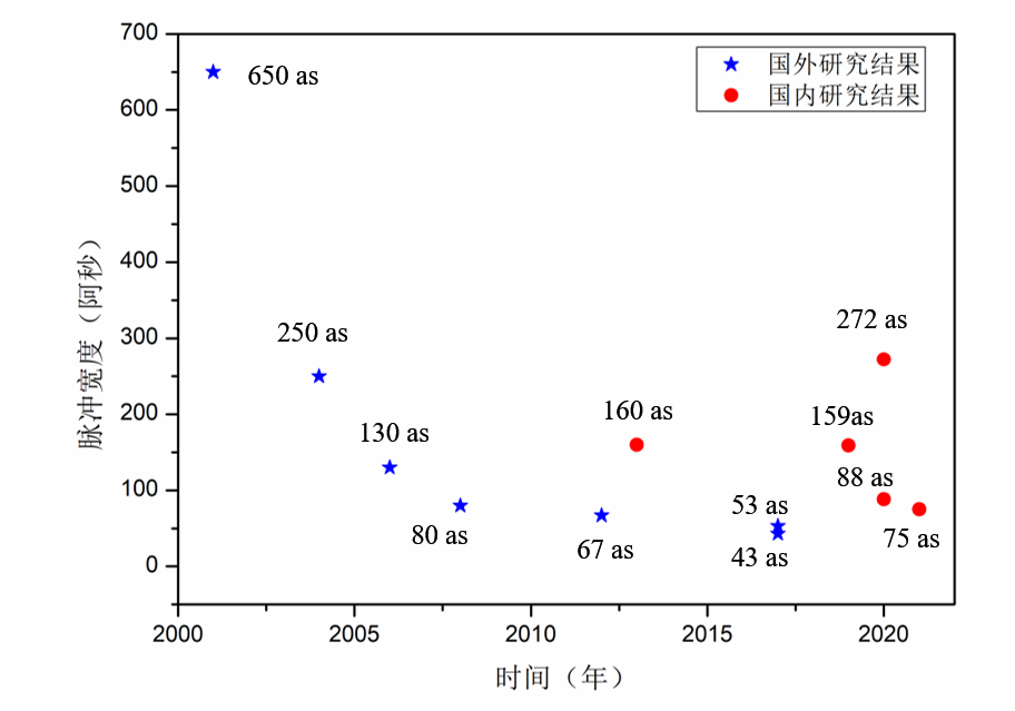 2013年,中国科学院物理研究所实现了160 as的孤立阿秒脉冲。此后,华中科技大学和国防科技大学在2020年相继实现了272 as、88 as的孤立阿秒脉冲。