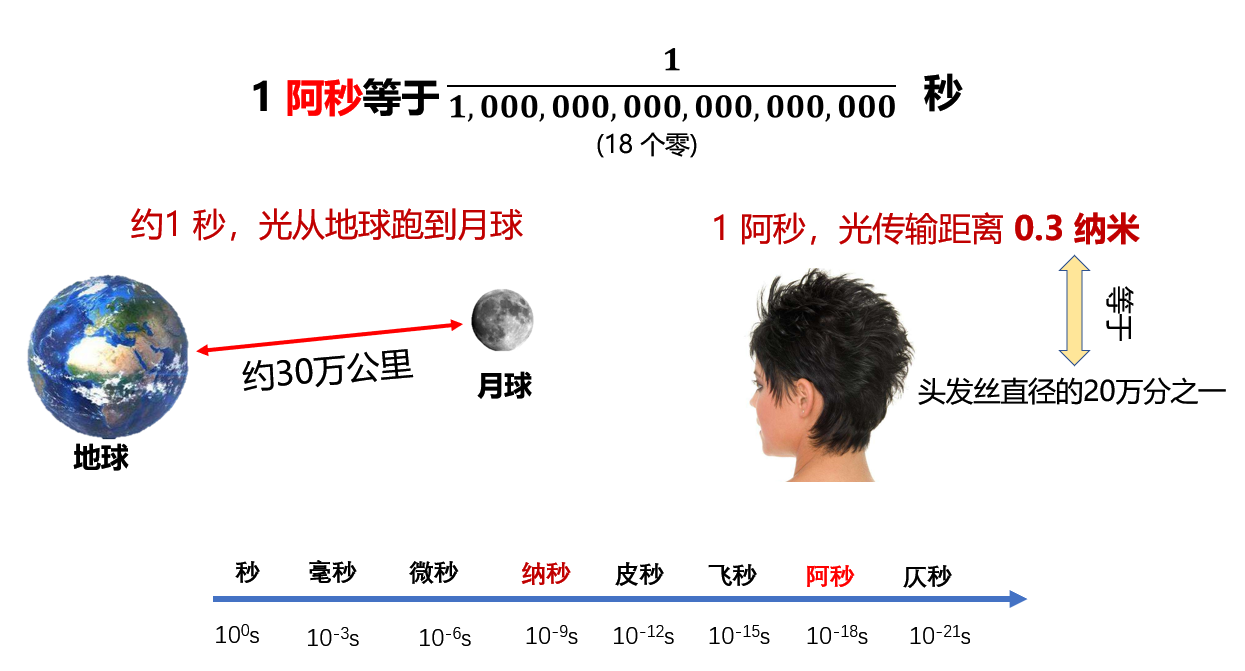 阿秒仅仅为10-18秒,如果说光从地球跑到月球的时间大约需要1秒,而在1阿秒时间内,光只能传输0.3纳米,约为头发丝直径的二十万分之一。