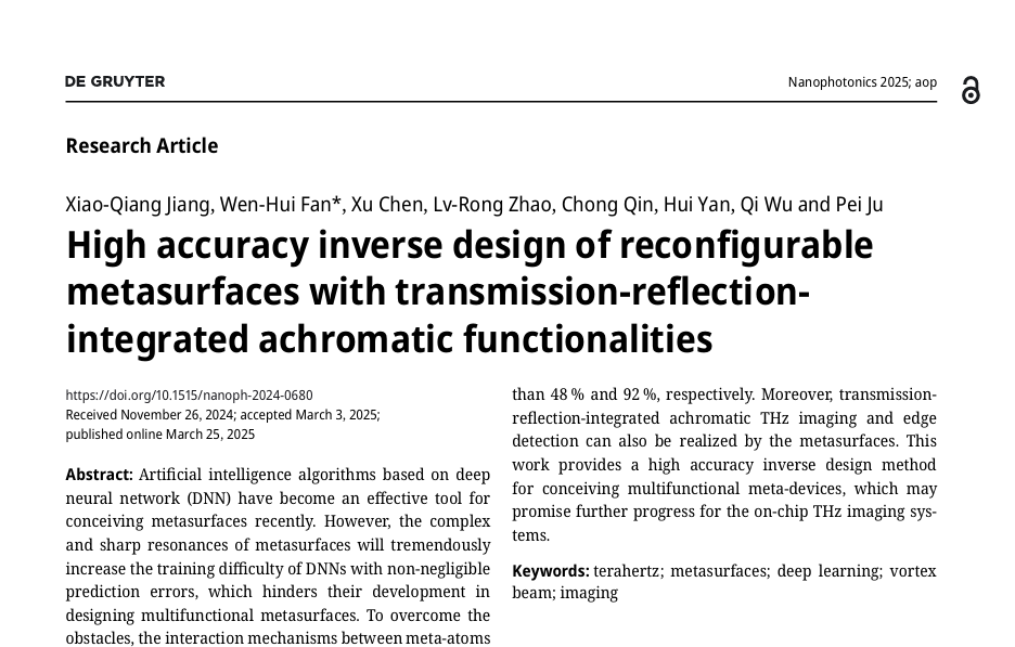 近日,超快光科学与技术全国重点实验室在太赫兹频段超表面逆向设计领域取得新进展,相关研究成果发表于光学类国际知名期刊Nanophotonics(IF=6.5)。论文第一作者为江晓强博士,通讯作者为范文慧研究员。西安光机所是第一完成单位和通信单位。