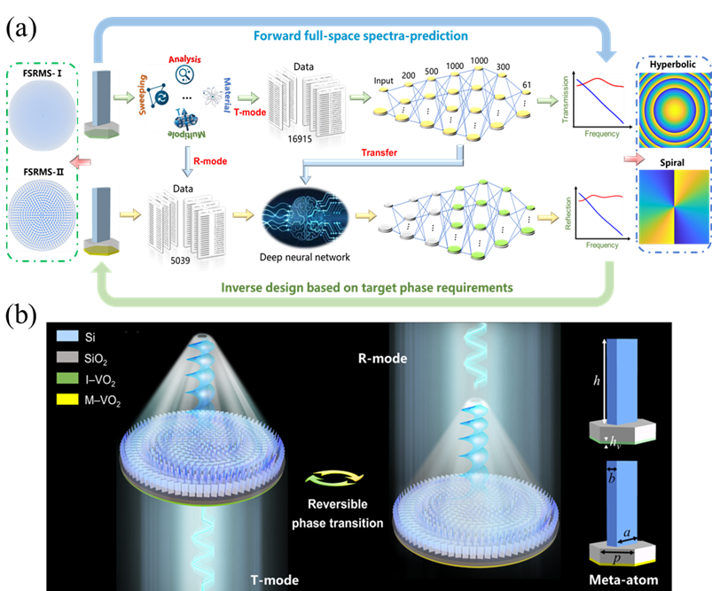 对此,研究团队提出了一种融合物理机制分析与深度学习算法的逆向设计策略。通过多极矩散射能量理论,系统分析超构单元与太赫兹波相互作用的物理机制,并据此设计性能优异的超构单元,构建高质量数据集。结合深度神经网络和迁移学习算法,该策略降低了神经网络对训练数据的需求,减少了迭代次数。测试结果表明,神经网络预测值与实际仿真值的相对误差仅为10–4量级。基于此,研究团队构建了在0.7–1.3THz频段具有透射/反射双功能的宽频段聚焦涡旋太赫兹波产生器。该研究为多功能超表面的实现提供了高精度的高效逆向设计方案,有望拓展超表面在片上太赫兹通信和成像系统等领域的实际应用。