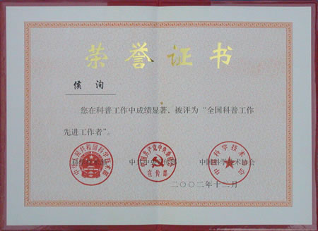 2002年12月18日,在北京召开了"全国科学技术普及工作会议"。我所侯洵院士在这次大会上被授予"全国科普工作先进工作者"光荣称号。
