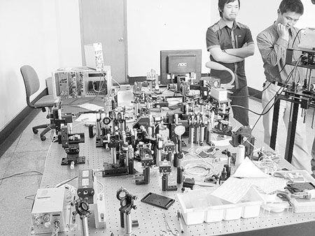 中科大-清华联合小组的研究人员在发送端调校光学设备(来源:中国青年报)