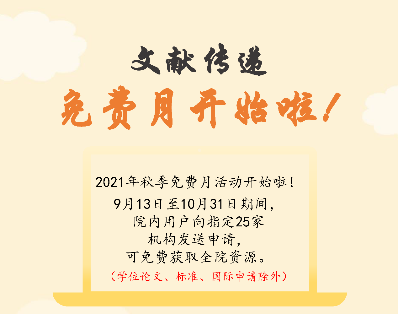 为了更好地支持全院的科研、教学以及创新发展,中科院文献情报中心联合24家服务机构,共同开展此次2021年秋季中科院“文献传递免费月”活动,面向院内用户提供免费文献传递服务。
