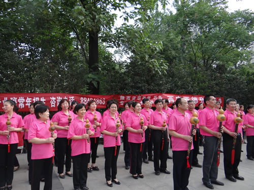 首先由西郊分会副会长于荣江致词,紧接着是陕西省葫芦丝巴乌专业委员会副会长李宝成代表王厚臣会长作了简短的讲话,接着一个比一个精彩的葫芦丝吹奏表演开始了,我校葫芦丝班和葫芦丝演奏队的队员200多人参加表演了三个节目,《赛江南》、《木鼓神韵》、《雪域阳光》,每一曲吹奏都带给人们无限的暇想和美的享受。参加演出的学员们自信老练,观看的群众大饱眼福拍手称快,李会长看到这情景不停的说,“象这样群众欢迎的活动我们还会不断的轮流搞,让更多的群众参与和观看”,火热的天气、火热的场景和人们火热的心情汇成了火热的海洋。