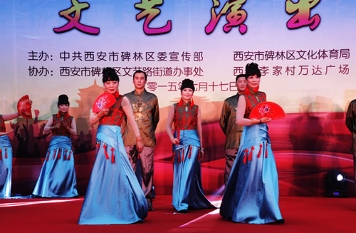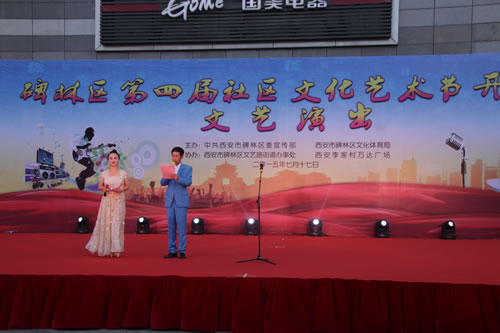 7月17日晚7点整,由中共西安市碑林区委宣传部、文化局主办的“碑林区第四届社区文化艺术节”在李家村万达广场拉开帷幕,碑林区文化宣传部主要负责人等参加了开幕。来自西安歌舞剧院的艺术家们带来了开场舞《彩绸飞舞》,随着音乐的响起,台上十几位舞者挥舞着手中的彩带,旋转、跳跃,吸引了现场,上千名群众驻足观看。随后,我所阳光艺术团的中老年模特队带来的《梨花颂》,以其大气恢弘的场面,整齐优雅的姿态,赢得台下观众不断爆发出阵阵掌声。来自西安歌舞剧院、西安市说唱艺术团的艺术家们以及社会团体献上精彩节目。为现场上千名社区群众奉献了一场精彩的文艺演出。为社区宣传文化事业的发展增添了绚丽的一页。演出期间,住在附近一位姓刘女士说:我看到的模特多是在舞台上来回走,这样的模特表演我第一次见,等我退休了也要到你们那里去学习。