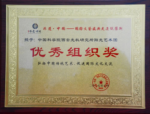 为促进中国和俄罗斯两国文化交流,广泛传播中华民族灿烂悠久的传统文化,通过国际舞台展示中俄两国人民积极向上的精神风貌和艺术素养。10月12至18日,来自中俄两国的艺术家通过极具本民族特色的音乐、舞蹈、戏曲等多种艺术形式在俄罗斯舞台上同台竞技,演员们向两国人民及全世界展示了他们和谐、进取、阳光的精神风貌。一个个精彩纷呈的节目,令全场观众赞不绝口。由西安光机所老年大学阳光艺术团舞蹈队选送的舞蹈《桃花红杏花红》以精湛的技艺、婀娜的舞姿,充分展现了中国文化的唯美精深,赢得评委及观众的高度赞誉并摘得桂冠赢得“金奖”,同时西安光机所老年大学也荣获了“优秀组织奖”。