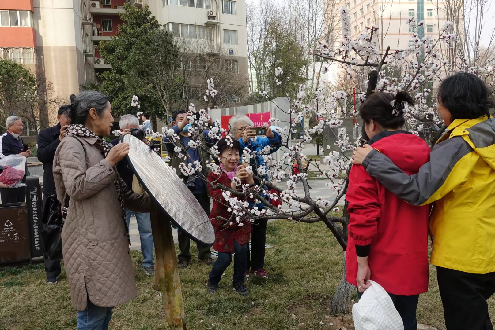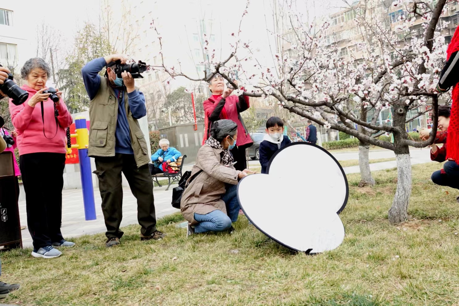 3月7日,友谊路园区,春光明媚,山杏花绽放,花香四溢,令人心旷神怡。一大早,老年摄影师们扛着“长枪短炮”,拎着大包小包,拿着三脚架、反光板等摄影器材,兵分四路,一组为庆祝三八活动主会场室内拍摄,创作活动现场纪实人像,抓拍人物精彩瞬间摄影。其他三组,拍摄园区环境人像,进行艺术创作。摄影师们在园区选取拍摄景点,确定机位,安装器材,准备就绪,待机开拍。