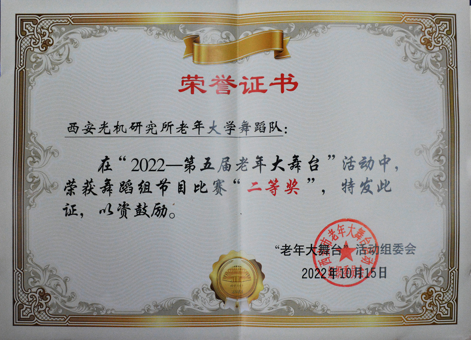 礼赞新时代,奋进新征程,2月26日,由西安市卫生健康委员会、西安市文化和旅游局、西安市民政局、陕西西安市老龄事业发展基金会主办的“春满长安第五届老年大舞台活动颁奖盛典”落下帷幕。西安光机所老年大学选送的舞蹈“生命的河”以灵动飘逸、热情奔放的表演将舞蹈艺术与文化内涵表演相结合,赢得大赛“二等奖”。
