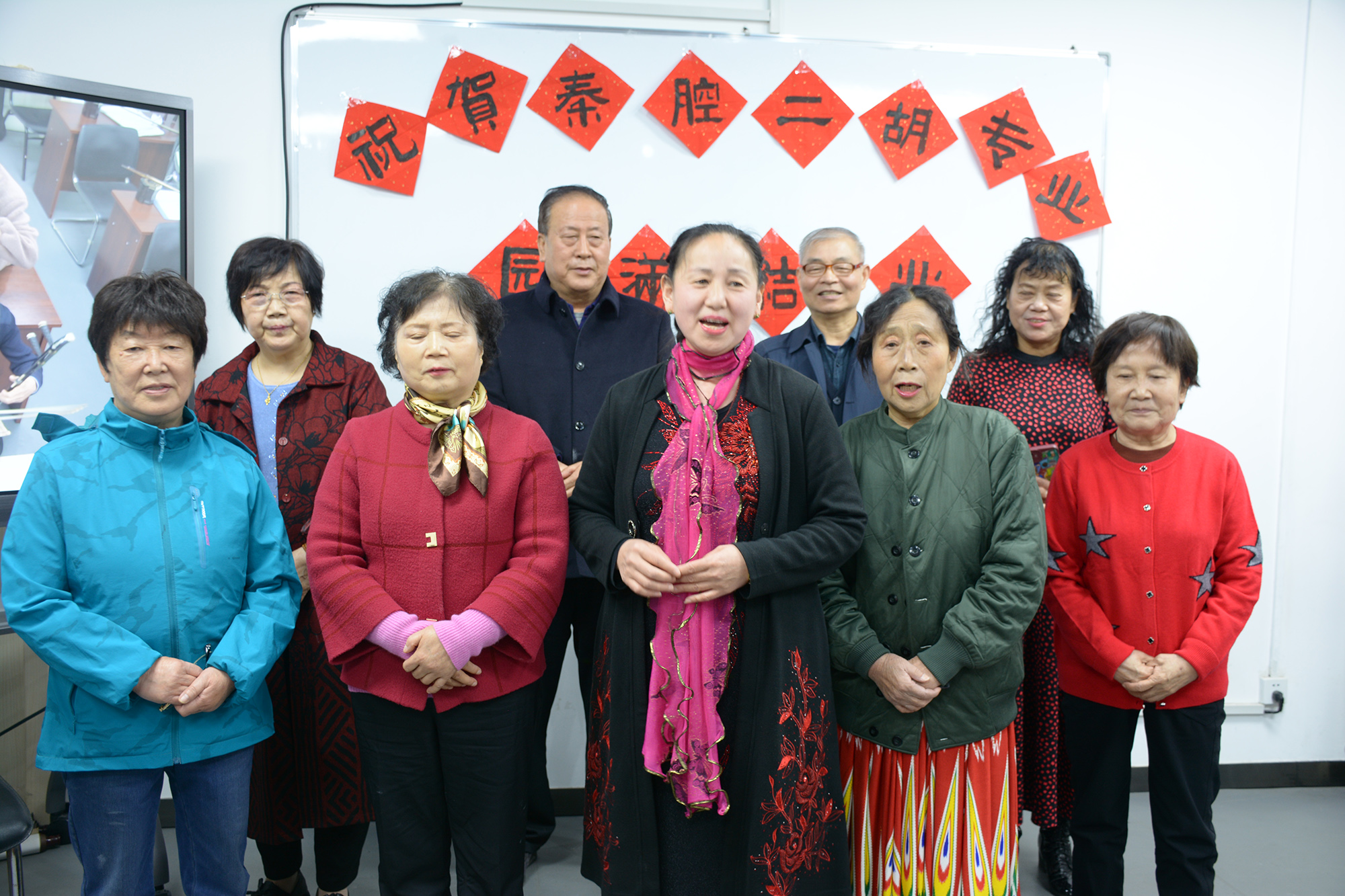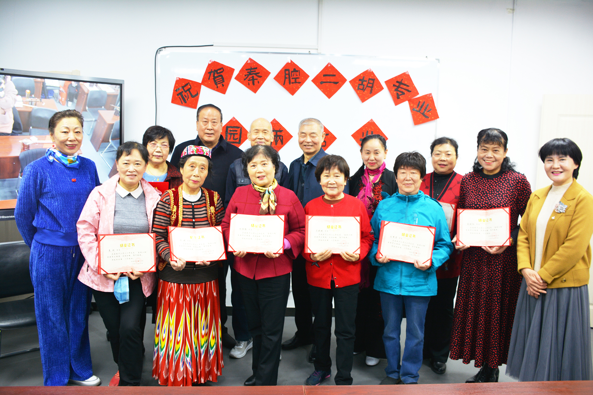 典礼过后,联谊会在学员们深情的秦腔表演《秋风吹》中拉开序幕,联谊会节目中既有展示学员们琴技的二胡合奏《小开门》《永寿庵》,也有秦腔二胡伴奏《赵五娘端慷碗》《柴郡主》《西湖山水》《我常念大姐情》,还有学员们激情演绎的《新疆舞》,即兴创作的《七律》《抗击疫情》《念奴娇》,最后联谊会在陈老师板胡伴奏、秦腔大家合唱《祖籍陕西韩城县》中圆满结束。