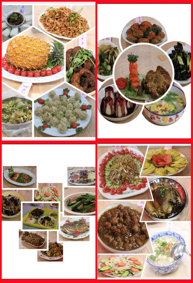 本次厨艺大赛共有冷热荤素,近40道风味各异的美味佳肴参赛展示,其中不乏一些地方特色美食及专业厨师才敢上手的大菜、硬菜,这当中包括有陕西名菜葫芦鸡、深海鱼头、粉蒸肉、菠萝饭、风味香酥鸡、糖醋里脊、珍珠丸子、烘焙小点荷花酥等,同时还有许多针对老同志年老体弱身体状况而自创的清素可口的菜肴,如五彩豆腐汤、素三鲜狮子头、翠竹报春等菜品,从菜品的制作方法看囊括了煎、炒、烹、炸、蒸、拌、烤等多种烹饪技能。