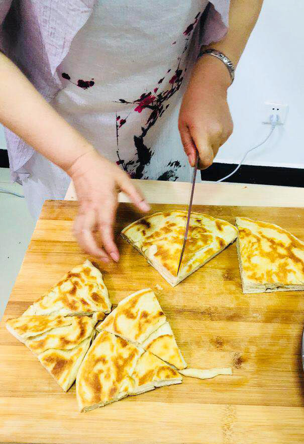千层大饼是一道家喻户晓的传统小吃,作为发面大饼和面不能太硬要稍软一些,同时如能配以葱香加大料的油酥,大饼将会更加美味可口。活动期间被推选第一次上阵的当值“大厨”,面对千层大饼的具体操作有些放不开手脚,随后有三位会员先后以“面皮叠加式”、“面皮左右旋转式”等不同的制作方法给当值的会员演示了千层大饼的制作技巧,经过手把手的传授,以前没做过大饼的会员很快就掌握了要领,较熟练的自主完成饼坯的制作。随着一阵阵浓郁的面饼香味飘来,酥香可口的千层大饼出锅了,当大家品尝着自己亲手制作的美味小吃时,一致称赞太好吃了,那种成就感不由得洋溢在每个人的脸上。(西安光机所离退办申广元 供稿)