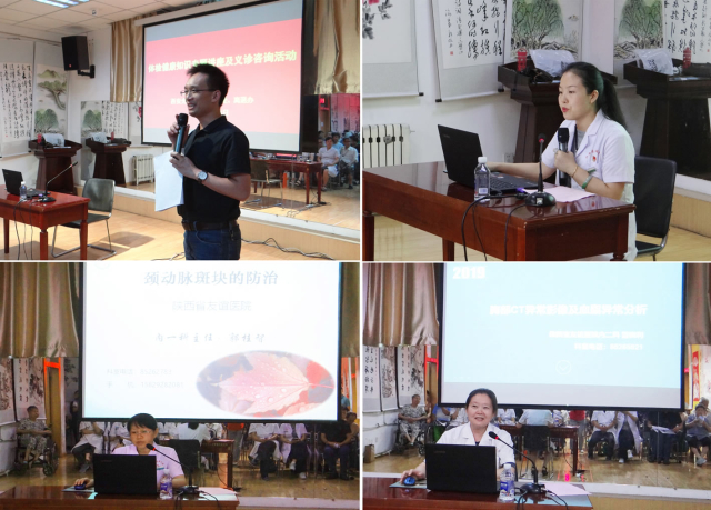 首先,陕西省友谊医院医联体办公室主任王霞为大家做题为《2019年度光机所离退人员健康体检结果汇总分析报告》,介绍了本次体检的基本情况、体检要素、主要异常结果数据统计及分析。随后,医院神经内科主任郭桂智做题为《颈部斑块的防治和TCD数据分析》的报告,主要讲述了颈部动脉斑块形成的原因、过程、危险因素、导致脑卒中的危害、注意事项、防治措施等,还就超声经颅多普勒(TCD)的简要原理、检查结论的意义做简要说明。第三,医院呼吸消化内科主任雷锐利为大家讲解肺部异常影像及血脂异常,讲述了肺部结节、肺大泡、肺间质纤维化、胸膜肥厚、粘连、纤维条索影、钙化影的意义,通常检测的血脂六项、《中国成人血脂异常防治指南》中血脂异常的4种类型、血脂异常引起的疾病及防治等做了进一步阐述。第四,医院内分泌康复科主任边芳做《糖尿病及甲状腺科普》知识讲座,从糖尿病相关检测项目意义、甲状腺功能检测指标的意义、甲状腺结节的意义三个方面讲述了糖尿病、甲亢、甲减、甲状腺结节的基本知识、防护措施和注意事项。第五,医院检验科主管检验师郭洁主要讲解了肿瘤五项和七项所含项目的内容和意义,解读新技术对肿瘤筛查发挥的重要作用。最后,医院肿瘤科主任张靖伟对体检报告中B超、肿瘤标志物的异常结果进行解读,对肝肾等器官囊肿、血管瘤、脂肪肝、胆囊息肉、胆囊结石、前列腺增生等疾病的基本知识和检查方法做综合介绍,对肿瘤标志物检测做了基本介绍,一般不单独作为肿瘤诊断依据,健康人轻度增高不能认为患有肿瘤,会有多种影响因素,可一月后复查,还要结合临床症状、影像学结果。
