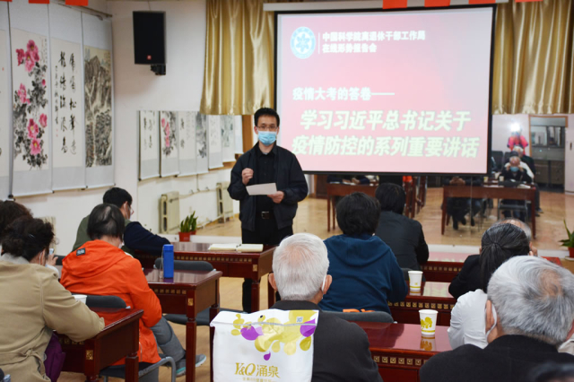 本次报告会,中科院离退休干部工作局特别邀请了中央党校(国家行政学院)科学社会主义教研部教授、中央党校函授教育优秀教师、全国党校系统第三届精品课获得者李志勇同志作报告。李志勇教授做了题为《疫情大考的答卷——学习习近平总书记关于疫情防控的系列重要讲话》的主旨报告。他结合疫情防控工作实际,从三个方面进行了详细阐述:一是系统回顾了习近平总书记设计疫情防控工作的系列重要讲话的总体情况,二是梳理总书记讲话中阐明的11个基本观点,三是对几个问题进行了系统思考和深入解读。习近平总书记围绕疫情防控工作发表的一系列重要讲话,贯穿着鲜明的时代特征,内涵丰富、思想深刻、要求明确,既是习近平新时代中国特色社会主义思想在指导应对这次重大突发公共卫生事件中的生动体现,又是一系列富有思想性、战略性、前瞻性的新论断、新观点,从一个全新视角丰富了习近平新时代中国特色社会主义思想,具有重大的现实意义和长远意义。