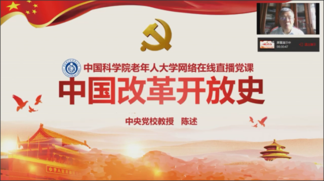 在中国共产党建党99周年即将到来之际,根据中科院离退休干部局统一部署,6月23至24日,离退休党总支组织离退休七个党支部150多名党员,认真直播聆听或回放收听了原中央党校党史部社会主义新时期教研室主任陈述教授,通过网络直播平台所做的《中国改革开放史》在线党课。