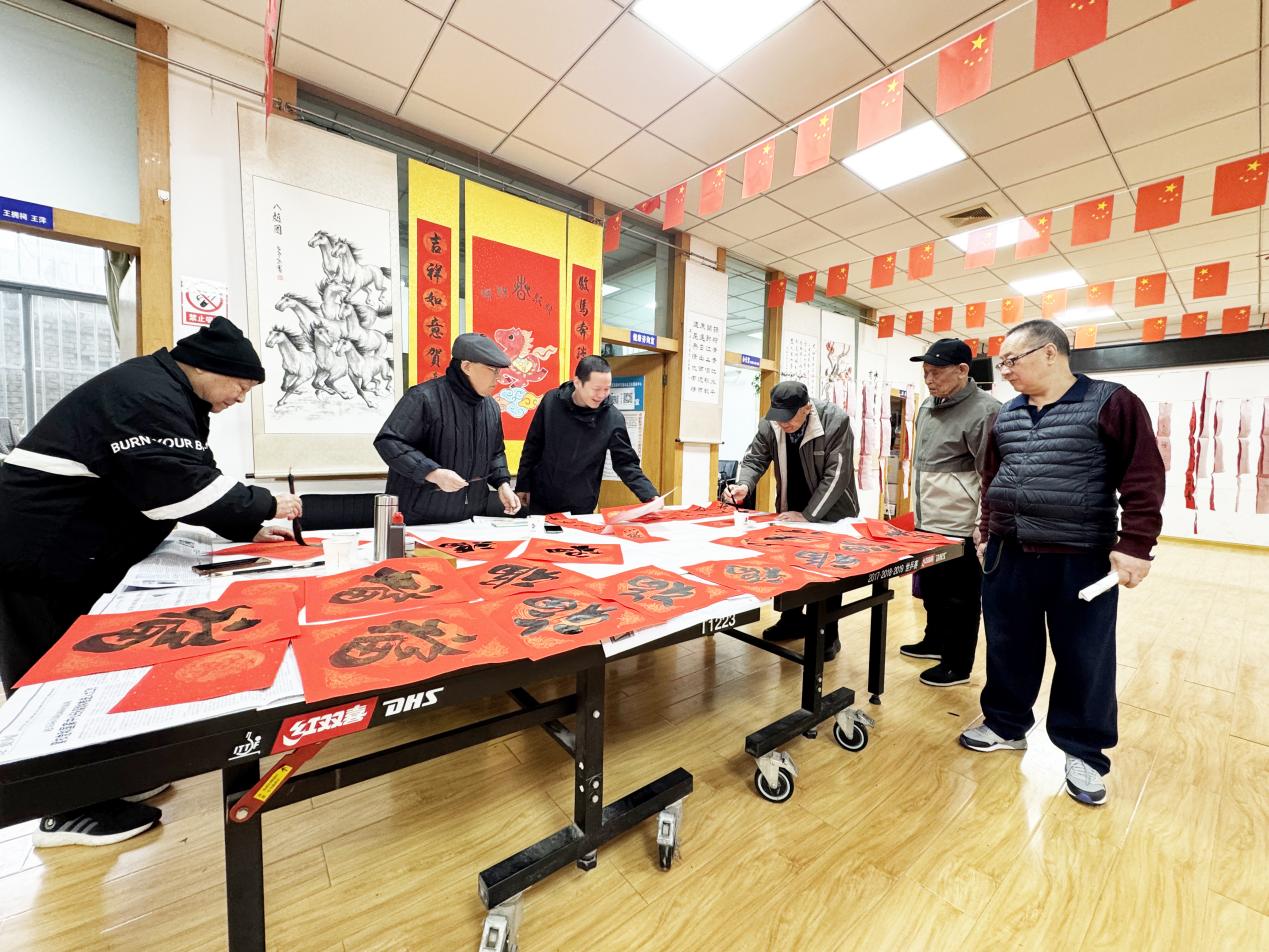 书法爱好者们精神矍铄、挥毫泼墨,在大红宣纸上书写出一副副寓意吉祥的春联,一个个饱满传神的“福”字跃然纸上,将马年新春的美好祝福凝于笔端。