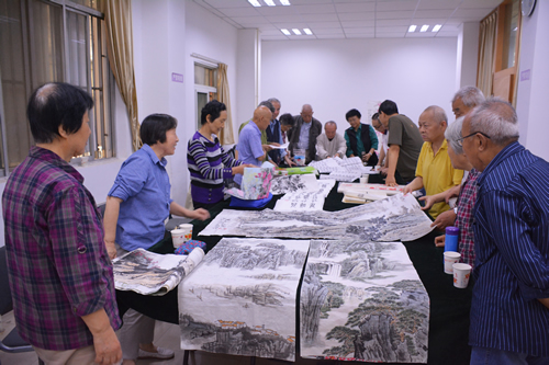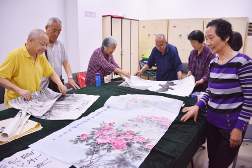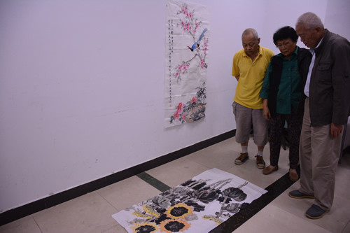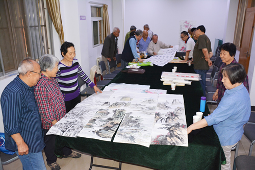 9点左右大家齐聚在活动室,20多名书画学会会员和爱好者纷纷拿出近期精心创作的50余幅书画作品。大家一一展示成果,相互交流心得,畅谈创作体会。一幅幅惟妙惟肖的书画作品,顿时吸引住了大家,有栩栩如生的桃花、水灵灵的葡萄、生机勃勃的小鸟,和气吞山河的山水画;也有生龙活虎的楷书、奔放的草书、飘逸潇洒的行书。他们或用笔精墨妙的绘画作品表达爱生活爱祖国的诚挚心声,或用初学涂鸦的作品抒发共建和谐社会的浓厚情感。活动现场气氛热烈,充满欢声笑语。