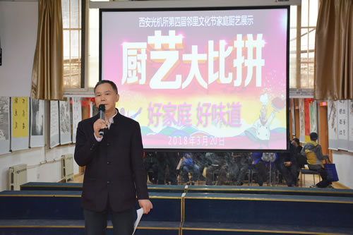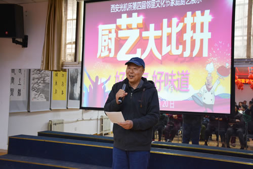 所家委会主任、离退休党总支书记李广路致辞,他首先感谢给本次邻里文化节出谋划策的老领导老前辈,感谢向本次厨艺大比拼提供菜品的职工和家属。他指出美食文化在中国历史悠久,备受职工群众所喜爱,为展示所内众多家庭厨艺爱好者的美食烹调手艺,在他们的一致倡议之下,西安光机所老年厨艺协会应运而生,他表示家委会和离退办将不遗余力的为大家搭建好平台,提供各种保障,促进大家用厨艺传递快乐,以美食促进和谐,他预祝这次邻里文化节厨艺展示和联谊活动取得圆满成功。