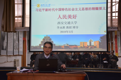 为了让离退休党员更加深刻领会习近平新时代中国特色社会主义思想,3月21日上午,所离退休党总支特别邀请陕西省中国特色社会主义研究中心特约研究员,西安交通大学马克思主义学院马克思主义原理研究所所长、教授、博士生导师李永胜,在友谊路园区离退休职工活动大厅做了一场题为《新时代中国特色社会主义思想精髓——人民美好》的专题辅导报告。离退休党总支全体委员, 6个支部的支部书记及委员,离退休党员职工等120余人参加了专题学习。离退休党总支书记、离退办主任李广路主持报告会。
