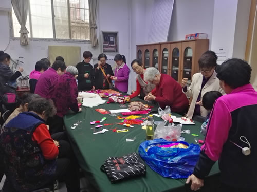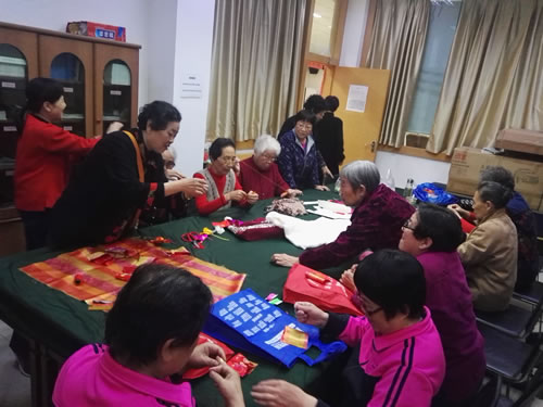 首场活动中,王玉珍会长教授大家做传统手工艺品——香包,与会人员拿到材料后,按照讲解和演示的制作步骤:剪裁、缝制、填充、塑型,同志们很快学会了,她们用智慧灵巧的双手制作出了一个个做工精致的心型香包、栩栩如生的鱼型香包。精美的作品吸引了许多老同志前来欣赏,现场喝彩声、欢乐声此起彼伏,一片温馨祥和、热闹非凡的愉悦气氛。