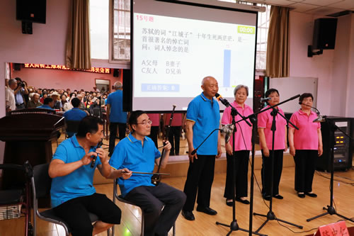 本次诗词大赛设两项内容。首先是朗诵活动,朗诵协会会员们将古诗词吟唱融入到现代歌曲中,用富有特色的吟诵方式深情朗诵,让大家提高了对中国古诗词的了解。其中有秦腔吟唱《小池》,有笛子、二胡伴奏吟唱《使至塞上》,有四种方言吟唱《回乡偶书》,还有深情并茂的配乐诗朗诵《子夜吴歌》《无题》《水调歌头》,让与会人员感受了经典古诗词穿越时空的经久魅力。接下来,100名参赛选手用答题器分别进行了诗词对接、诗词知识、诗词填字等环节的竞赛。期间,诗词协会会长李佑国拿出自创书画作品《山居秋暝》,向与会人员点评作品中“竹喧归浣女,莲动下渔舟。随意春芳歇,王孙自可留”的意境神韵。诗词爱好者梁蕴绵女士娓娓道来,给大家传授如何识记古诗词,现场演绎《秦声秦韵话唐诗》。诗词知识巅峰对决,诗词释义循循善诱,与会人员如沐春风,享受了一次文化盛宴。经过激烈角逐,何淑英、张志俊、吕金玲、吴宝兰、苗翠华、幕翠兰6名参赛选手,以深厚的诗词底蕴和较强的随机应变能力脱颖而出,获得首届诗词大赛一二三等奖。