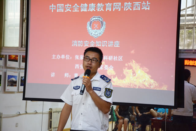 董湃首先通过西安市近两年的典型火灾案例,讲述了火灾的严重危害,引起大家对火灾的高度重视。重点讲解了日常生活和工作中各种火灾发生的原因,尤其是发生率极高的电火灾,原因包括电线电器老化、过负荷使用、安装和设置不合理、电器故障、违规操作、不良用电习惯等六种。接着视频讲述了火灾由小到大发展的快速性和火灾发生时浓烟传播的极高速度。火灾浓烟的特性:一是温度高(450度以上),二是毒性强(含一氧化碳、二氧化硫等),三是速度快(每秒3-5米),这些特性导致的危害性是极其严重的,后果是惨痛深刻的。着重讲解了火灾自救和逃生技能,厨房油锅着火的灭火方法和技巧,必备防火设备及使用方法。讲座结束后,在临近的家属院广场上,董湃细致介绍了灭火器的使用方法,并亲自规范操作指导,大家轮流上场,亲身体验使用灭火器,现场进行灭火演练。