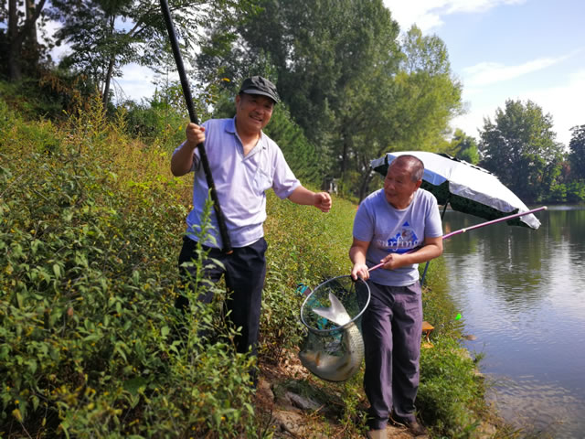 老钓友们根据各种鱼的生活习性,选择不同的饵料,调配饵料、调整鱼漂,打窝、挂饵、抛线等系列动作一气呵成,个个手握钓竿,凝神静气,目不转睛,耐心等待。半小时左右,有鱼儿上钩了,开局第一条鱼,大家都很兴奋,有说有笑,为成功钓手送去俏皮的祝贺。随着时间推移,陆续有鱼儿上钩,大的小的,鲤鱼草鱼、花鲢白鲢,相继落入水边的鱼库。本次活动,亮点频出,收获颇丰,徐永钦钓了七条鲢鱼,最好的是会长宋树德钓了一条9斤重的大草鱼。虽然也有个别钓友没有钓到多少鱼,但他们的心情是愉悦的,因为能与老伙伴们一起畅享大自然的美景,比什么都开心。