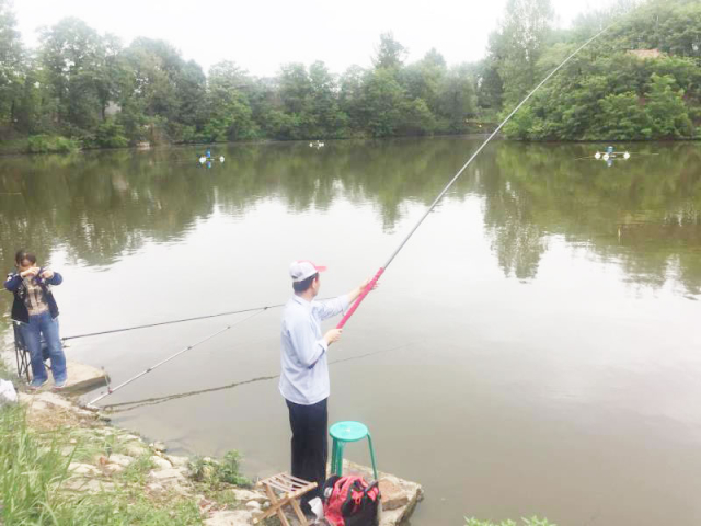 初夏的郊外,绿树成荫,密不透风,水塘周围草色青青,空气湿润,犹如置身于世外桃源。到达长安区汤峪水库钓鱼点后,宋树德会长做好活动安排,着重强调了安全问题,要求大家远离深水区,接着讲述了本次活动的规则及要求,然后宣布比赛开始。每一位老同志选好自己满意的钓位,开始钓前的准备工作。各就各位的会员们手持长枪短炮各显神通,有十几米的长杆,也有五、六米的短杆,还有可以抛出几十米远的海杆,又是打窝、又是调漂,忙个不停。很快就有人上鱼了,打响了胜利的第一炮,大家都情不自禁的喊着“上鱼了、有人上鱼了!”迅速调动起每个人的积极性。但马上又安静下来,一个个紧盯着自己的鱼漂,认真捕捉每一个令人兴奋的信号。一波接着一波,噼里啪啦,上鱼声不断传来,老同志们个个满面春风,笑逐颜开。会长宋树德、黄中敏更是忙个不停,一会儿给大家照相,一会儿询问每个人的上鱼情况,一遍又一遍的嘱咐大家注意安全,忙得不亦乐乎。