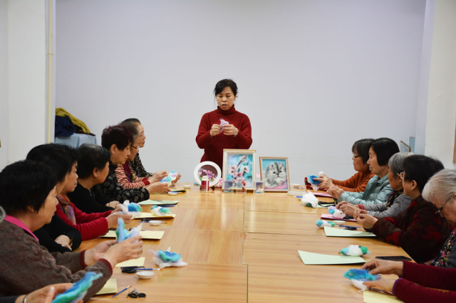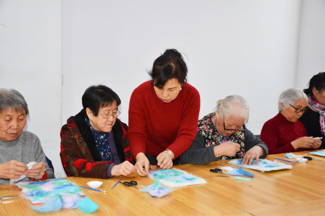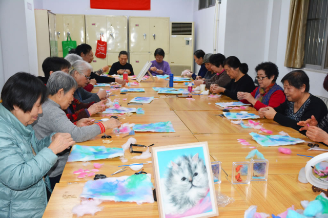 咸辉女士口传心授,带领老同志们采用搓、捻、贴、粘等手工技法,将五彩斑斓的棉花变成一幅幅栩栩如生的“梅花”作品。在学习棉絮画的制作过程中,大家对非遗文化艺术和民间工艺有了更进一步的了解,老同志们亲身体会到了优秀非物质文化遗产——棉絮画的特殊艺术魅力,加深了对非遗项目的喜爱。老同志们微笑的脸庞和专注的神态,让活动现场始终充满了轻松惬意的氛围。许多老同志说道,这些美好体验勾起他们的儿时回忆。