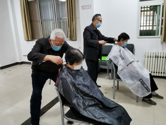 离退休职工活动中心的多功能室稍加改造,几把椅子并排,桌子间隔放开,一个简易的理发室应运而生。所老年志愿者协会成员按照疫情防控要求,全程佩戴口罩,进行体温监测,对双手及理发工具进行卫生消杀,以防交叉感染。前来理发的老同志秩序井然的在外分散等候,随剪随走,人员很少聚集。老年志愿者协会会长海孝永、副会长张帮录,亲自操剪,他俩轻车熟路地给老同志们围上围布,拿起梳子,挥舞剪刀,使用电推,他俩技艺精湛、动作娴熟,现场人员均佩戴口罩,或低头,或抬头,紧密配合着理发师的动作。通过理发师的巧手妙剪,老同志们个个精神焕发,神采奕奕。他们感激地说,“爱心理发确实为我们解决了大问题,感谢志愿者们,真心为他们点赞。”
