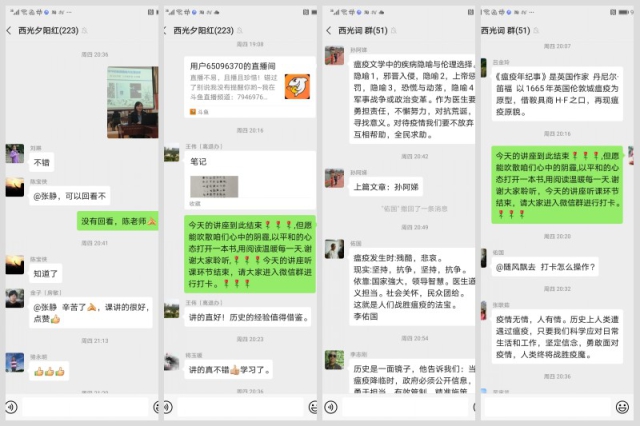老同志们听过在线视分享后纷纷在微信群内留言,写下听课笔记或启示。他们认为,世界各国共同面临来自瘟疫的挑战,只有通过推进国际疫情防控合作、维护和健全全球公共卫生治理体系,团结一致,协同合作,才能抵抗瘟疫的挑衅和肆虐,延续人类社会与文明的繁荣发展。(西安光机所离退办 张静供稿)