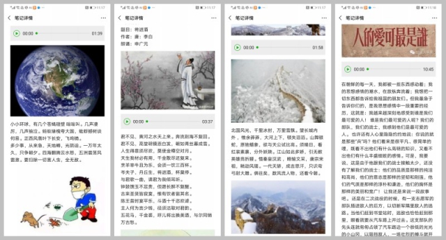 活动中诵读的有中华美文、名家名篇、经典诗词等多种篇目,诵读的作品体裁不拘一格,形式多样。诵读主题鲜明,内容积极向上,传递了满满的正能量。约30名诵读爱好者诵读的作品中既有歌颂祖国的文章《必胜》《谁是最可爱的人》《英雄》,又有经典诗词《沁园春·雪》《卜算子·咏梅》《七律·长征》,还有自创作品《情怀三镇》《抗冠魔》《战疫情》,这些作品从多个视角展现了中华文化的深厚底蕴。诵友们虽然没有见面,但都用智能手机编辑成图文并茂的美篇、笔记收藏、PPT,辅助配以图片、文字、视频、MP3等方式在微信群、QQ群巡回展示。他(她)们或独诵,或夫妻合诵,或祖孙同诵,用清晰的语言,优美的声音,把原诗歌、作品有感情地向听众们表达出来,传达出诗歌的思想内容,引起了诵友们和听众的情感共震,思想共鸣。