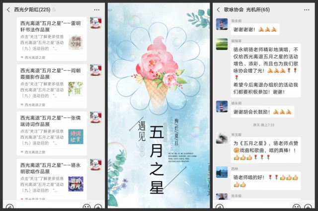 据不完全统计,本次活动先后共展出各类作品816幅,在微信公众平台分11批次,以“诗词欣赏”“书画空间”“美食天地”“舞动西光”“唱响西光”“手工天地”“摄影时间”等几个板块展出,浏览数累计达到10671人次。活动期间,西光离退休各微信群、老同志朋友圈内、公众号留言区“星光灿烂”的点赞声和叫好声络绎不绝,热闹非凡。根据人气数排名情况,最后评选出了5位“五月之星”,他们分别是雷雨、李佑国、吴金枝、耿永、赵丽珍,还评选出了5位单项之星,他们是“诗词之星”徐心平、“摄影之星”周金平、“书画之星”徐洁璇、“厨艺之星”吴宝兰、“舞蹈之星”张连茹、“歌咏之星”骆永明。
