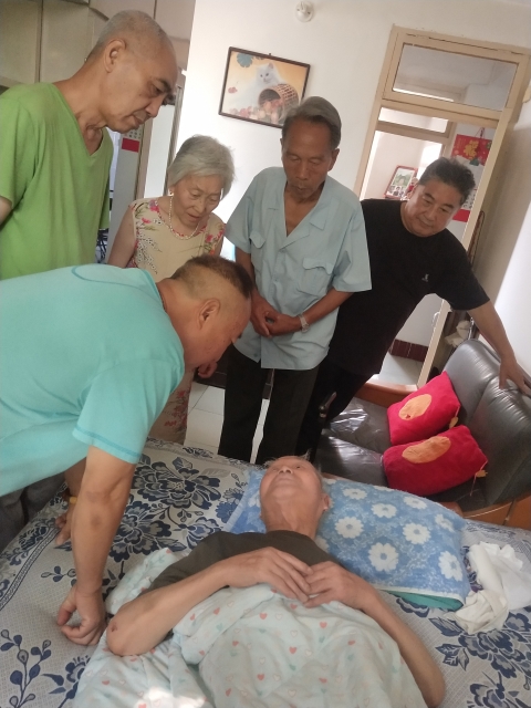 老兵张志敬早已准备好挂着抗美援朝勋章的制服,在高薛燕帮助下麻利穿戴整齐,郑重其事地与大家合影。所党委老书记姜长贵热情地招呼大家一一就坐,欣慰地与我们这些晚辈开心交谈,不时开怀大笑。杨长安参加了对印自卫反击战,他和老伴一边跟我们说话,一边把备好的苹果塞给我们品尝。离休老革命卞成虎十分珍惜老兵荣誉,急切地询问丢失的退伍证怎么补办。建国前参加革命工作的王桂花老人在她整洁的家里静静地和我们说着年轻时的工作经历,大家说着笑着享受着战友欢聚的喜悦。离休老革命郭学文又一次把他巧手制作的花瓶台灯、酒瓶台灯向我们展示,得意之情溢于言表。孙文山老兵不久前被车撞倒正卧床吸氧,看到我们到来,喜不自禁,双手比划着滔滔不绝,并互致军礼惜别。黎德厚是鲜战场上的老汽车兵,一辈子手握方向盘,行走在人生旅途中,如今卧病在床,但一双浑浊的眼睛依然闪烁着老兵识途的余光。