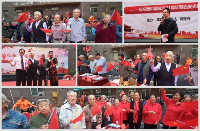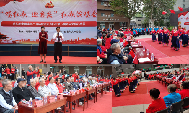 为了迎接祖国71华诞,9月30日下午,西安光机所离退休党总支“迎国庆 唱红歌”主题党日活动,在研究所友谊路园区18号楼前广场盛大举行。原所党委书记、享受副省(部)级单项待遇的离休老干部姜长贵,抗战时期离休干部家属代表杨淑慧、鹿福琴,解放战争时期离休干部郭学文、卞成虎,建国前参加革命工作的老工人王桂花,研究所原所长赵葆常,原副所长王尉周、周仁魁、周金平,原所党委副书记朱继贤等老领导;研究所老专家李育林、陈良益、熊仁生、李英才、张小秋、陈中仁等老研究员,还有退休党员、老同志及家属代表等320多人参加了活动。