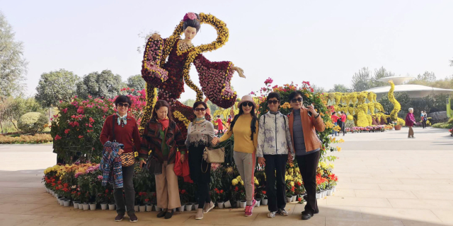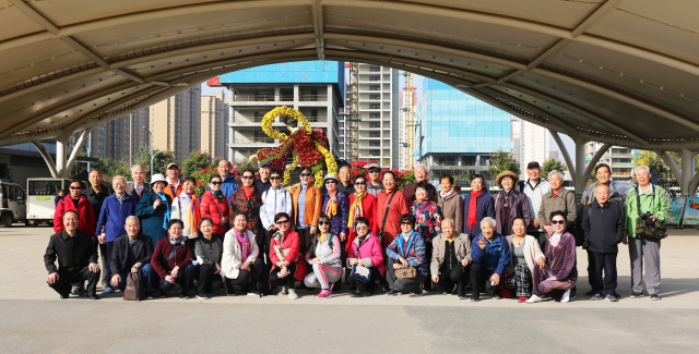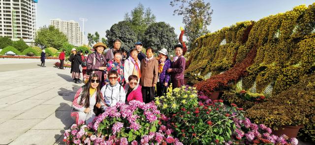 跟随着科普讲解员,老同志们陆续参观游览了独具三秦特色的水景园、百卉园、秦岭园、岩石园、太极广场等区域。展区丰富的造型和花式图案搭配各种时令花卉,采用地栽、地摆等形式结合,造型的布置可谓独具匠心,设计有“孔雀迎宾”、“菊花仙子”、“流光溢彩”、“水天同辉”、“争奇斗艳”、“菊舞蝶丛”等形态万千的造型菊,同时以各种时令草花强调层次结构,体现出菊花的意境之美,营造出了人与自然的和谐氛围。老同志们置身其中,领略到了大自然的美好,感受到了新时代的和谐,他们忘记了年龄,忘记了回返,在菊园里观赏品鉴,在花丛中穿梭游走。联想到秋菊的寓意,老同志们仿佛在梦里回到了家乡,正和家乡的亲人们登高赏菊,把盏话家常。