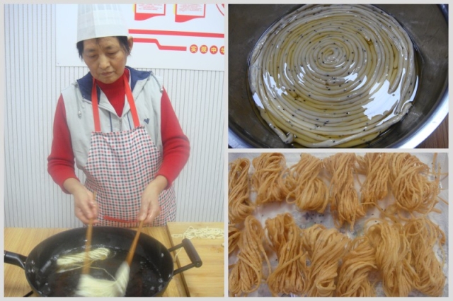 馓子虽作为一种小吃,但烹制的技法十分讲究,从和面到醒发到炸制每一个环节都与成品的最终成败有着密切的关系,郭巧绒大厨在馓子的制作过程中详细介绍了每一步骤的操作要领和注意事项:第一步和面要按照比例加入适量的食用油、盐、蛋液、花椒水、黑芝麻,揉成类似饺子面软硬的面团;第二步醒发是整个制作过程耗时最长的阶段,面团经过数次揉搓数次醒发,食材的形状也从面团状到短棍状再到长条状,随后将其整齐码入盆中用油浸泡进行最后一次醒发;第三步炸制也是一个十分关键的环节,馓子的半成品不仅要拉的细而且要粗细均匀,进入油锅后要随时调整火候并适时用筷子扭转馓子的形态,才能保证馓子火色匀卖相好。