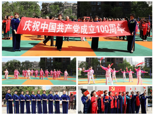 在活动的分会场7个离退休党支部部分党员、老年文体协会会员128人有序摆成的“100”字样并深情高喊“庆祝中共共产党成立100周年”。太极协会、模特协会、柔力球协会等文体协会的老同志还用特殊的表演方式向党献礼。