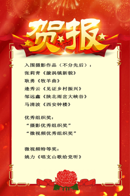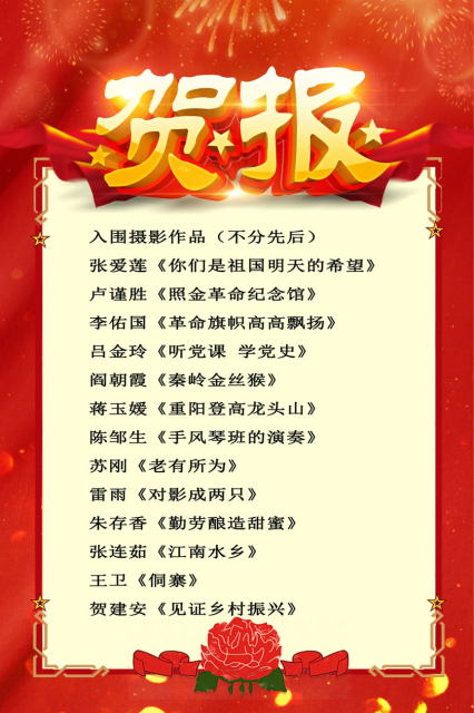 专家从主题思想、内容选材、制作水平三方面进行评审,西安光机所离退办报送的摄影作品中18位老同志入围,分别是:张爱莲的《你们是祖国明天的希望》、卢谨胜的《照金革命纪念馆》、李佑国的《革命旗帜高高飘扬》、吕金玲的《听党课 学党史》、阎朝霞的《秦岭金丝猴》、蒋玉媛的《重阳登高龙头山》、陈邹生《手风琴班的演奏》、苏刚的《老有所为》、雷雨的《对影成两只》、朱存香《勤劳酿造甜蜜》、张连茹的《江南水乡》、王卫的《侗寨》、贺建安的《见证乡村振兴》、张莉靑的《漩涡镇新貌》、耿勇的《牧羊曲》、逄秀云的《见证乡村振兴》、邹远鑫的《陕北雨岔大峡谷》、马清波的《西安钟楼》。由离退办精心策划组织、广大老同志参与拍摄、姚力编辑制作的微视频《唱支山歌给党听》斩获特等奖。(西安光机所离退办 张静供稿)