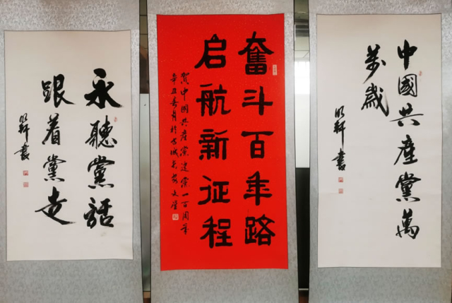 此次展览共组织书画作品近百件,经过认真品评,最终遴选、装裱,并向大众集中展览了57件优秀作品,这些展览的作品主题鲜明、内容丰富、形式多样,既有笔法流畅、书艺老成之作,也有推陈出新、独具风格之作;既有取材于党的发展历程的恢宏史书,也有选题于红色历史的身边故事,不仅体现了书法绘画的艺术性,更体现了敬党、爱国、拥护共产党的政治性,表现出书画艺术浓厚的文化底蕴和独特的艺术魅力。