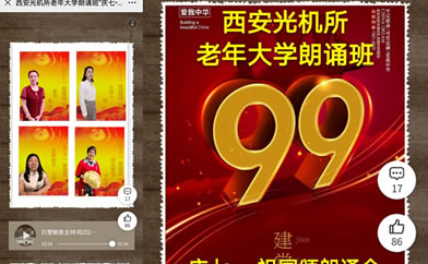 西安光机所老年大学举办“庆七一·祖国颂”主题朗诵活动在中国共产党建党99周年之际,西安光机所老年大学广大学员为抒发爱党、爱国、爱校情怀,朗诵专业同志们以微信平台为载体,组织开展了“庆七一·祖国颂” ...2020-07-06