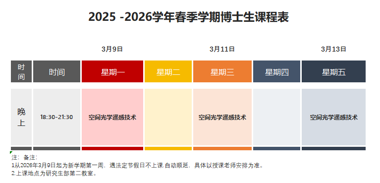 本学期我所为博士研究生开设1门专业学位课《空间光学遥感技术》(3学分)。课程对所内全体职工、研究生开放,感兴趣的自行参与,请注意保持良好的课堂秩序。